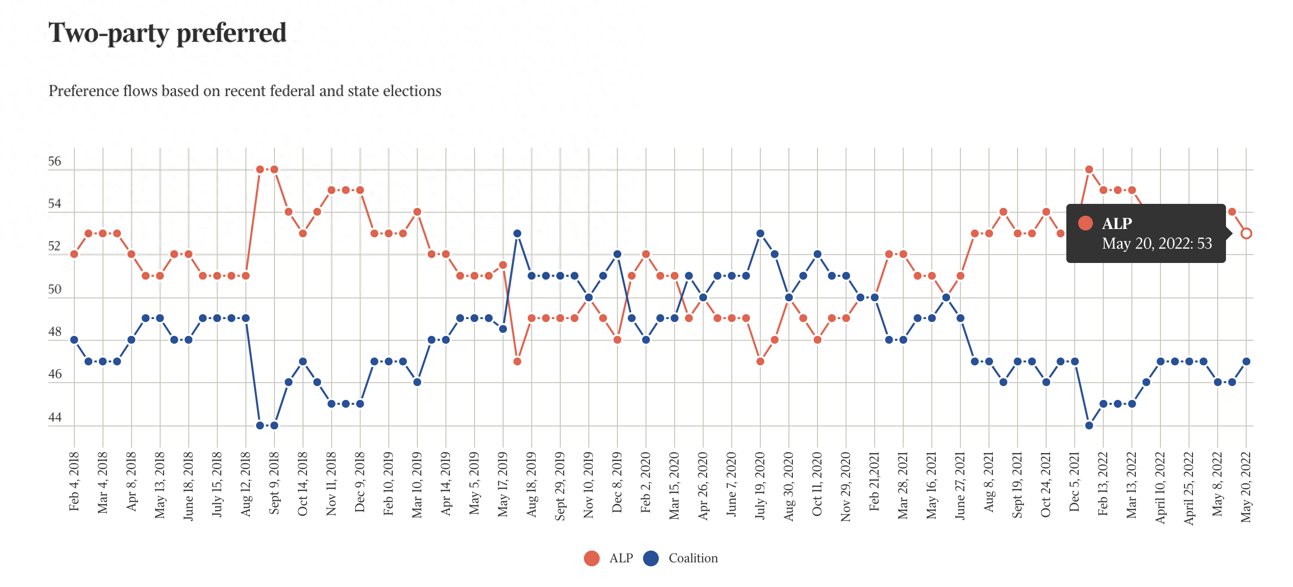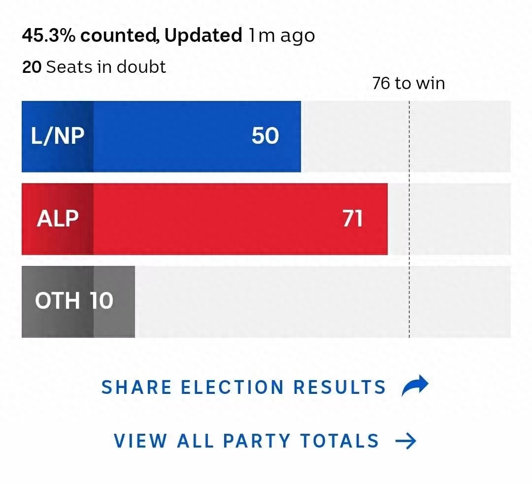 直到选举前一天,工党依然保持小幅领先,澳大利亚民调机构Newspoll的数据显示,5月20日工党支持率为53%,执政联盟为47%。舆论早有猜测,莫里森政权岌岌可危。
