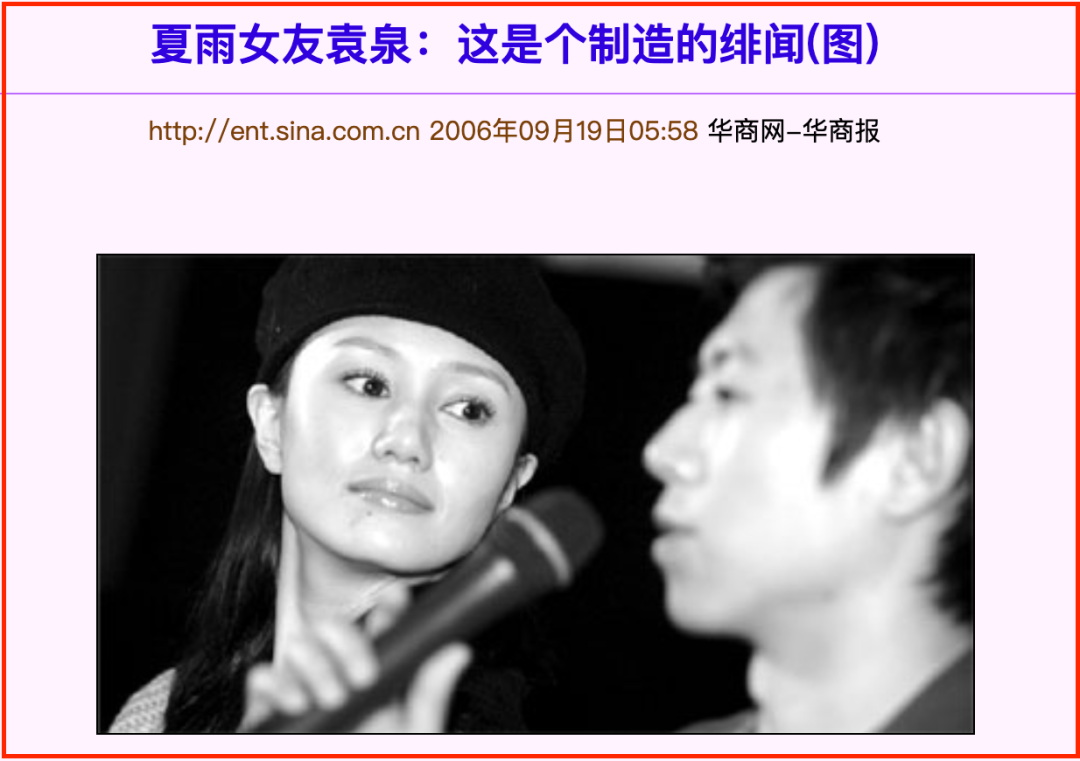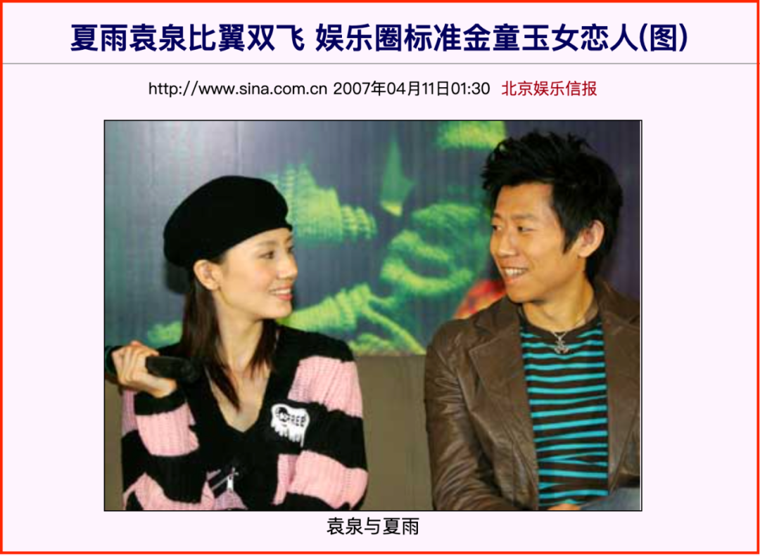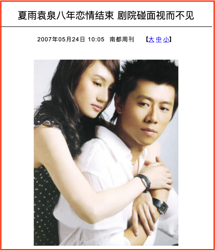 不过,就在绯闻曝光前两周,报纸还刊登了一则袁泉和夏雨的专访。