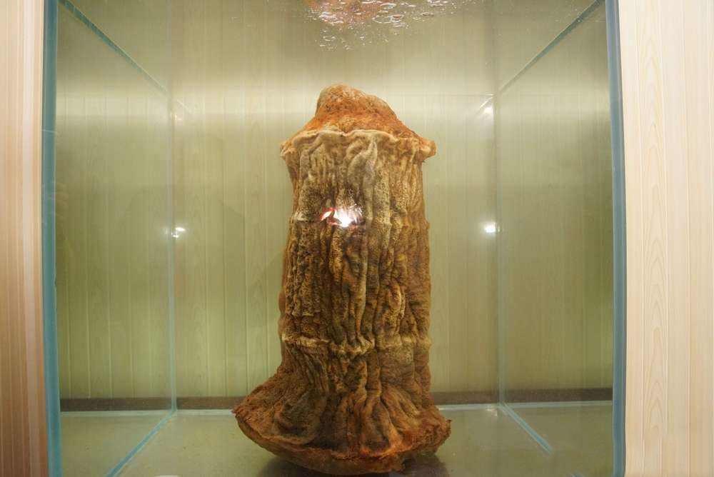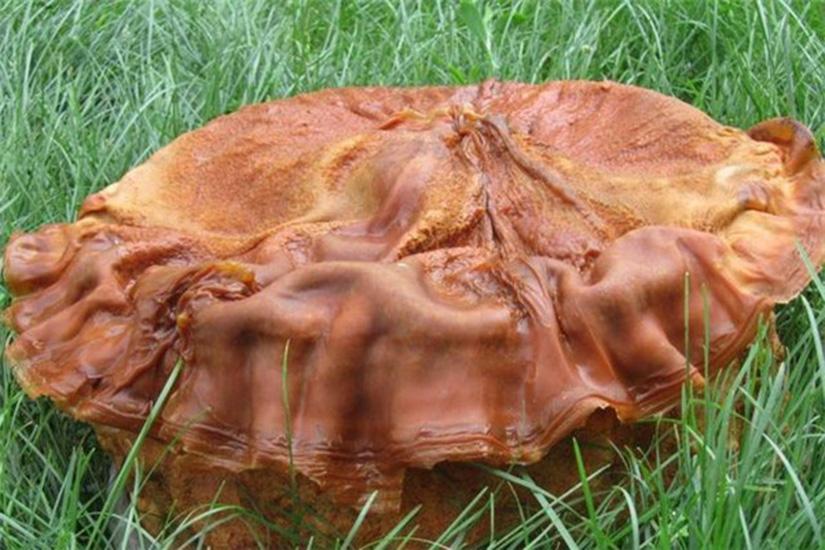 2020年,家住大连市的牟先生在草丛里发现了一块高约半米,全身红褐色的圆柱物体,表皮上布满了深浅不一的褶皱,用手戳一下还让人觉得黏糊糊的,很有弹性。出于好奇,牟先生把这块神秘物体搬到车上,回到家里一称,竟然有102斤重。