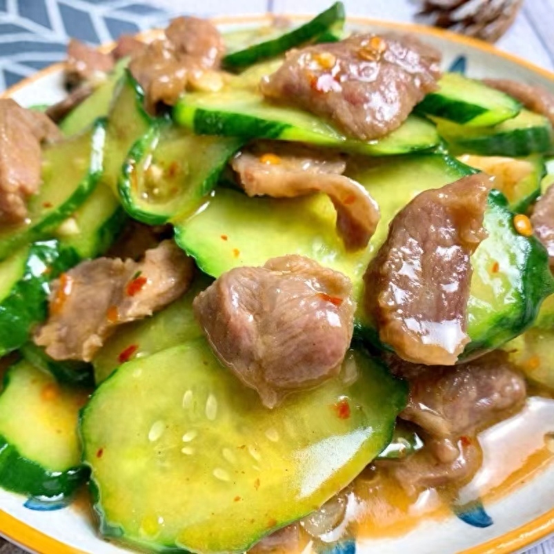 (4) 在锅内余油里下入蒜末、肉片,加适量盐翻炒片刻,再下入青瓜一起翻炒几下即可。