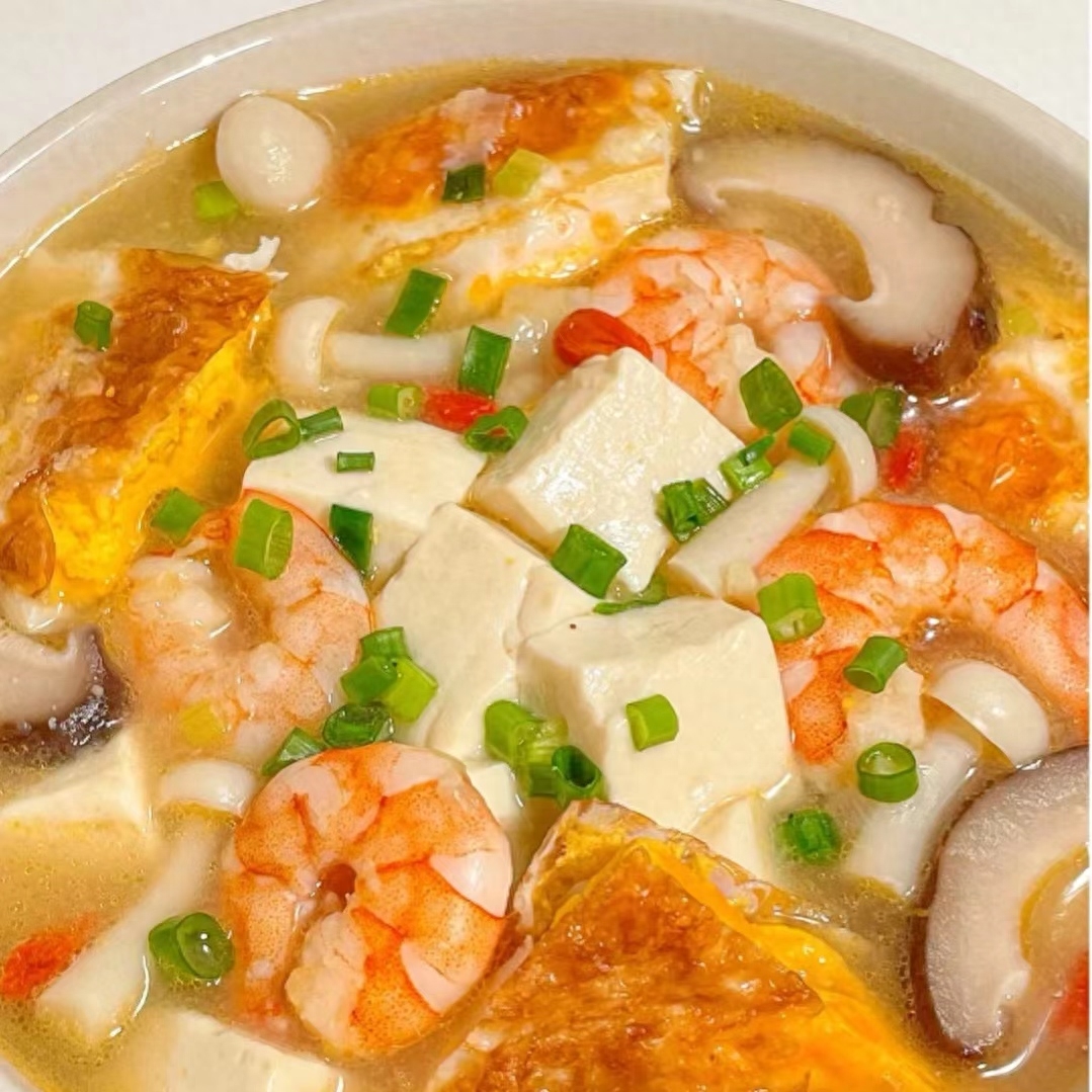 主料:虾仁、鸡蛋、白玉菇、香菇