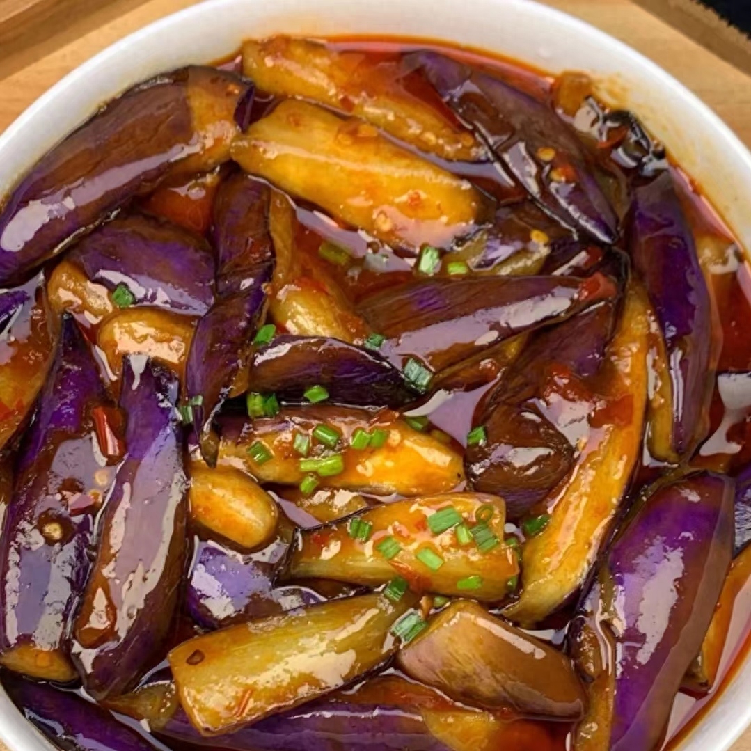 (3) 锅中油热,下茄子翻炒几下,倒入调好的酱汁焖3分钟,记得翻面炒一下,撒上葱花出锅;