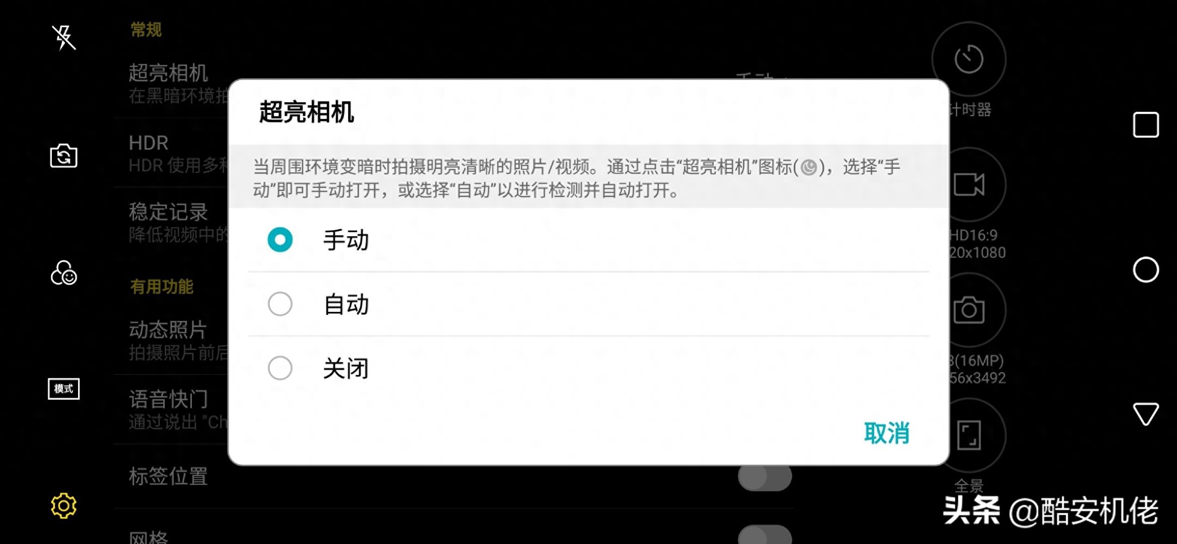 它会在光线不足的场景下提高画面整体亮度,但是又不会像 “超级夜景” 一样快速拍摄多张照片合成来提高整体素质。