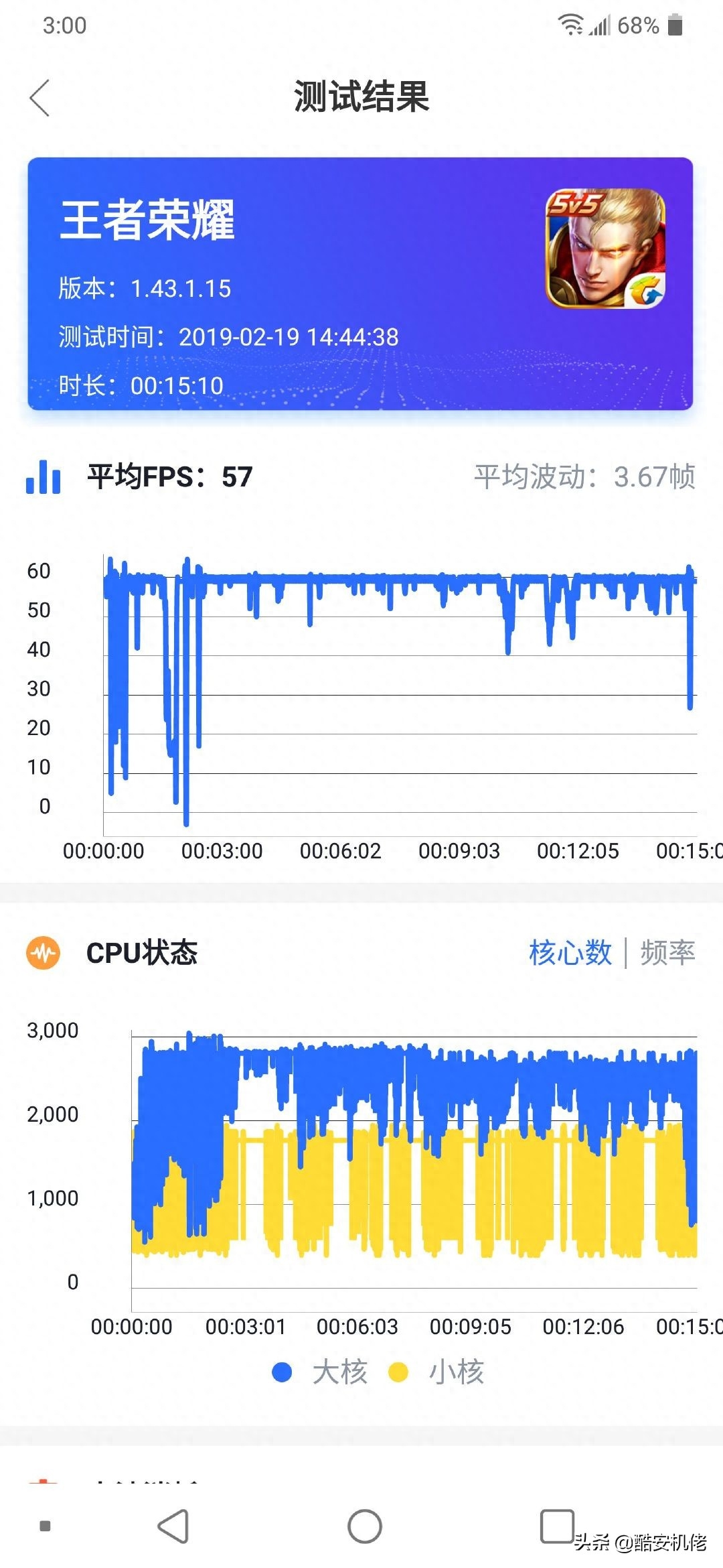 首先是王者荣耀,设置为超高画质,极限帧率,关闭抗锯齿,游戏全程还是十分流畅的,在复杂场景下会掉到四十几帧,但没有明显的卡顿,十五分钟游戏,平均帧数 57,耗电 8%。