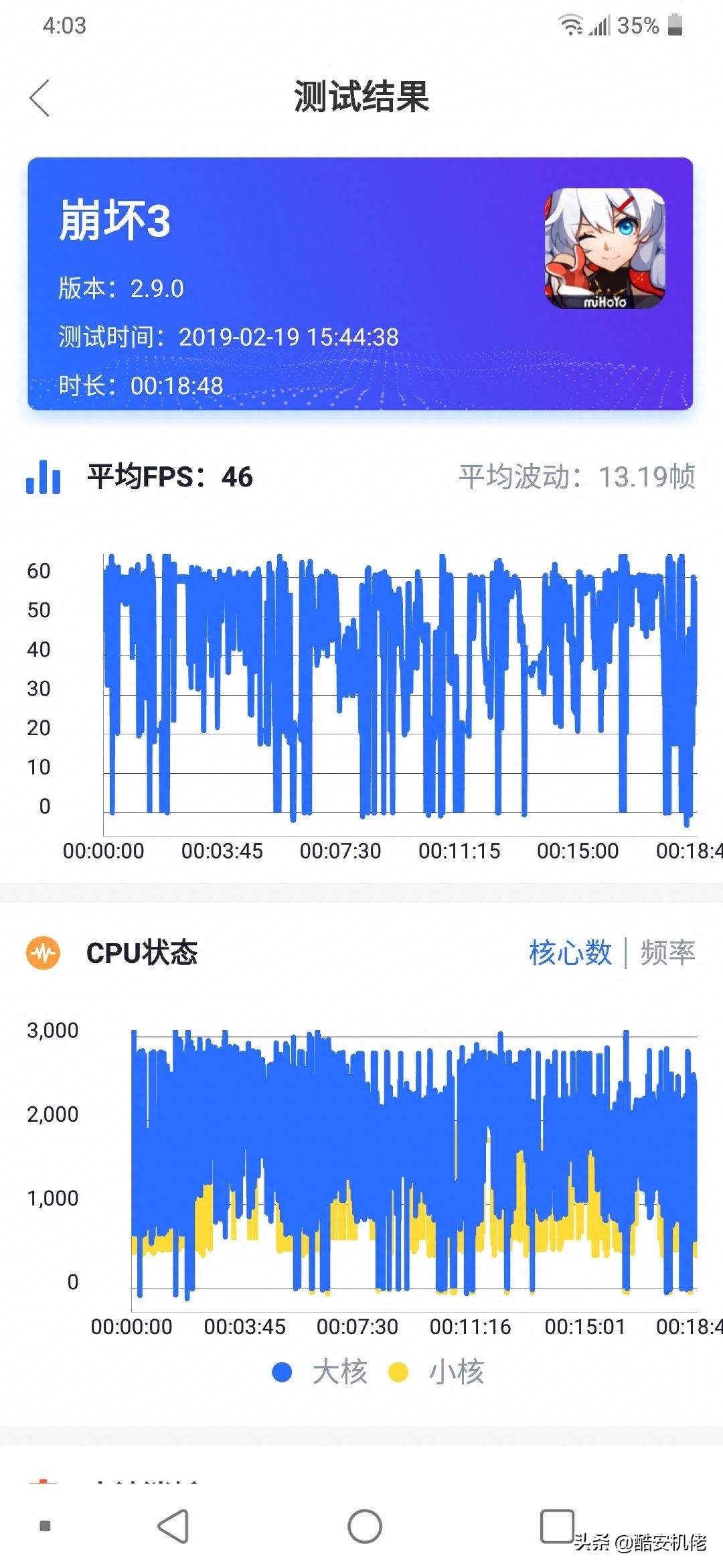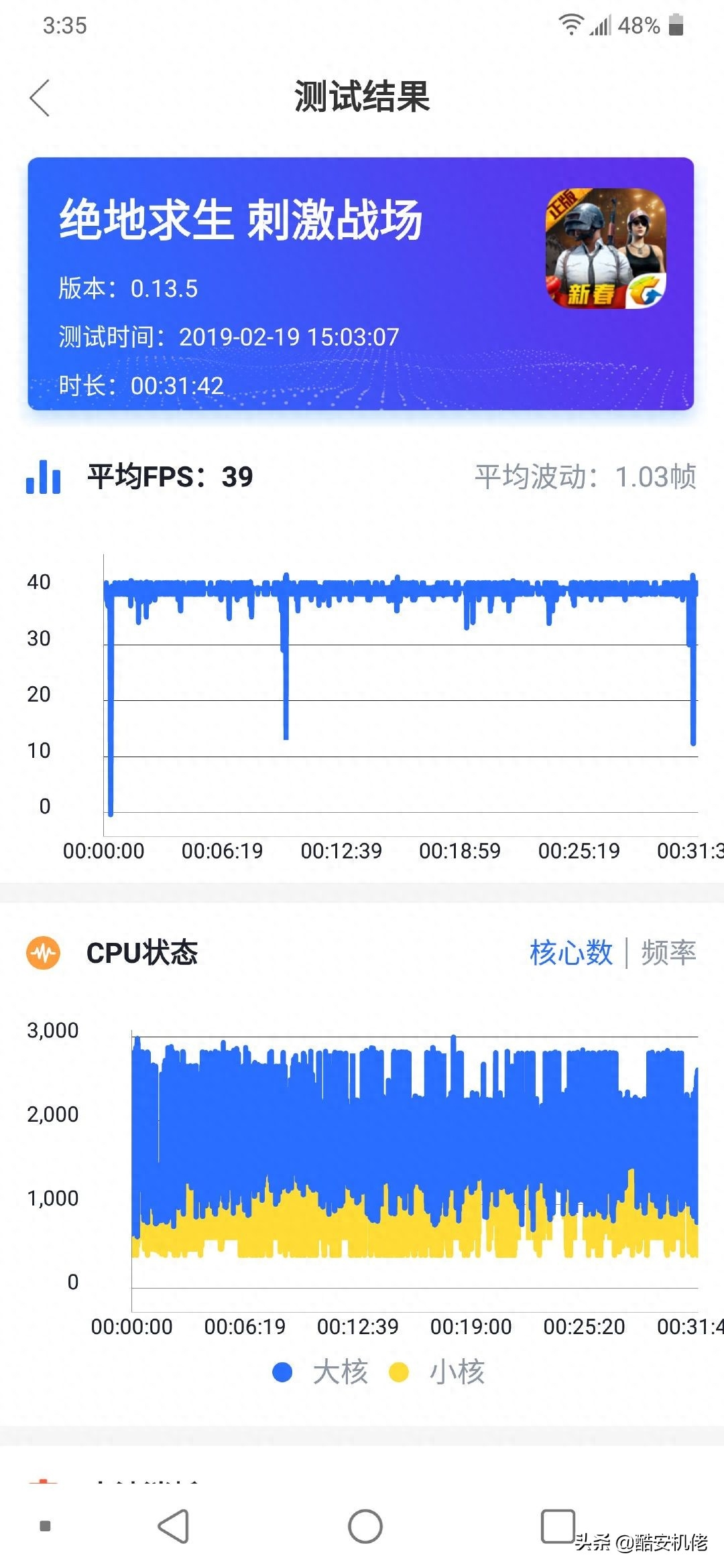 然后是刺激战场,帧数设置为超高帧率,其余默认,游戏全程都能保持在 40 帧满帧运行,三十分钟游戏,平均帧数 39,耗电 19%。