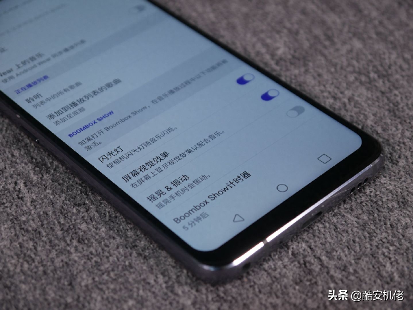 在自带的音乐里,LG 还提供了一个视听效果,叫 “Boombox Show”,包括闪光灯随音乐节奏闪烁,以及机身跟随摇晃震动,提供了两种视觉效果。