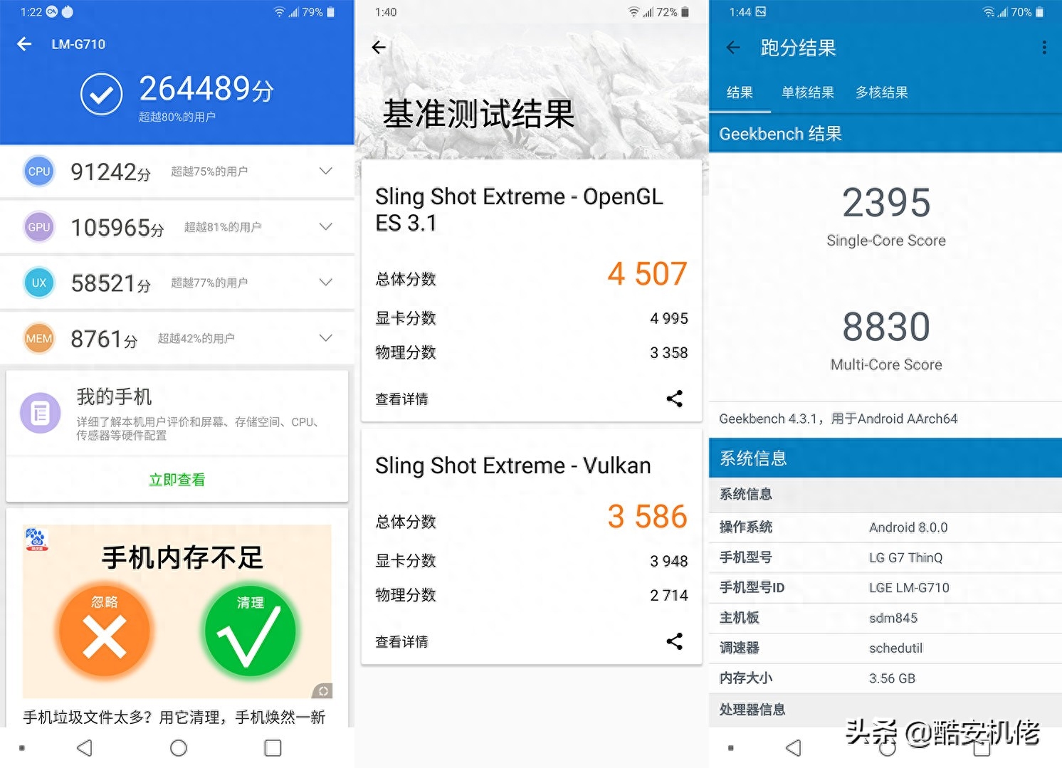 G7 在配置上搭载了骁龙 845 处理器,配合 4GB RAM,机身存储 64G,另外还有 6+128G 的 G7+,目前骁龙 845 仍旧是主流的高端处理器,不过遗憾的是,G7 因为不能 Root,所以无法通过更改 CPU 调度的方式来解放其所有性能,那我们来看下跑分吧。