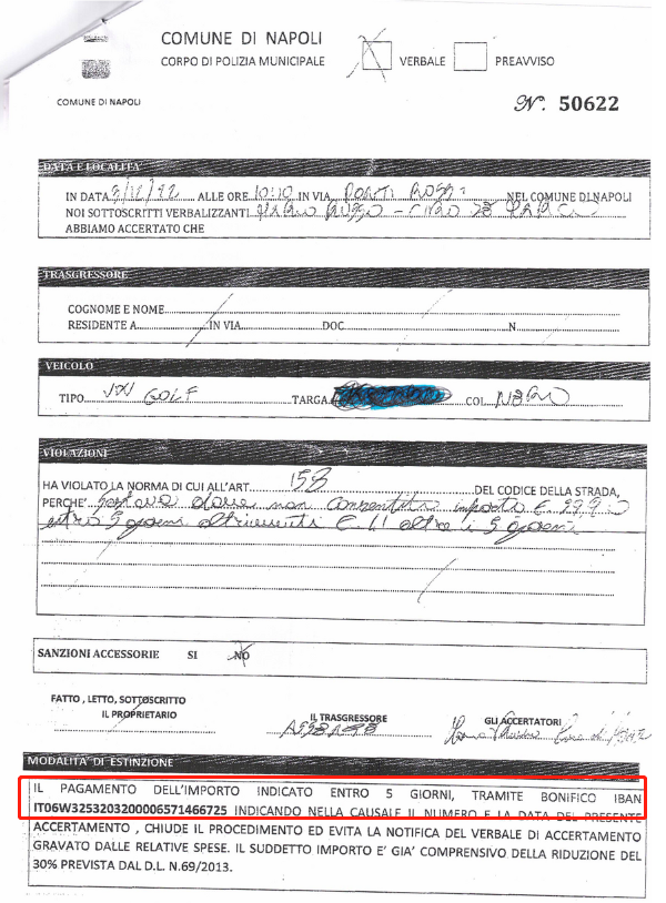 那不勒斯市政府现已就此发布声明,提醒车主应对可疑罚单格外注意,并公布了市政府在处理交通罚单时唯一使用的IBAN代码: