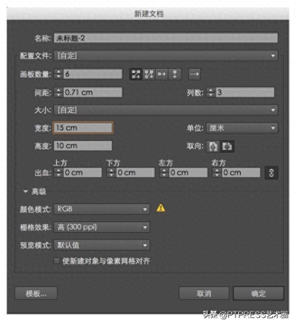 1.新建文档,设置画板数量为“6”,设置宽度为“15cm”、高度为“10cm”。