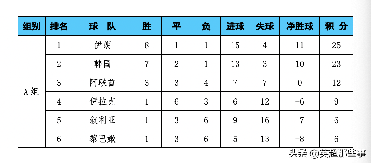 A组的比赛中,阿联酋主场1-0击败韩国队,送给对手12强赛首败,拿到了小组第3名,将与澳大利亚队争夺洲际附加赛资格。叙利亚主场1-1战平伊拉克,摆脱了垫底位置;伊朗队主场2-0击败黎巴嫩,超越韩国队升至榜首,黎巴嫩以副班长结束12强赛征程。