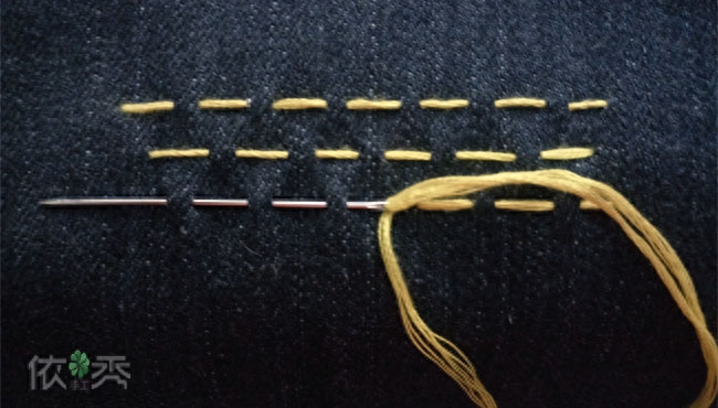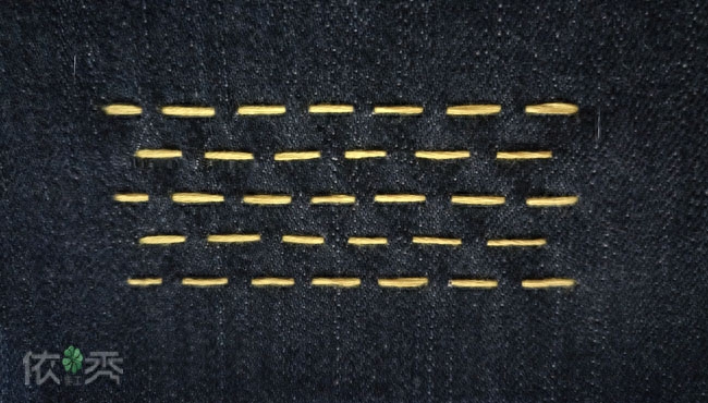 织补绣看起来和平针绣差不多,但是绣线在绣布正面的距离要比在绣布背面的距离长。绣多行的时候,从第二行起,针目开始呈交互状态。