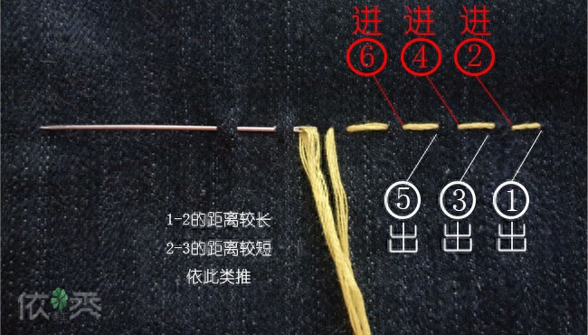 平针绣在刺绣时,每一针都保持相等的距离。在运针的时候,通常是用较长的针,一次性穿几针来刺绣。