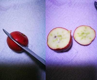 3.如下图所示,用小刀的刀尖把山楂的黑色部分挖去。