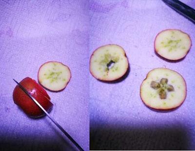5.再将剩余2/3的山楂从中间旋转切开成两块,中间部分的果核已经大部分裸露出来了。