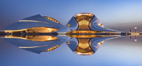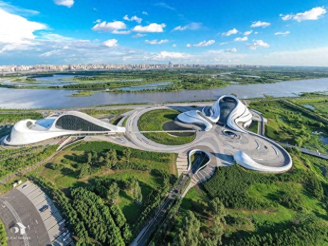 哈尔滨大剧院是哈尔滨的地标性建筑,总面积7.9万平方米,内含有1600座大剧院400座小剧院,考虑到旅游观光的需求设计者采用世界首创将自然光引入剧场的环保设计,在非演出时段减少照明用电,建筑整体风格也与周围湿地环境风格统一。