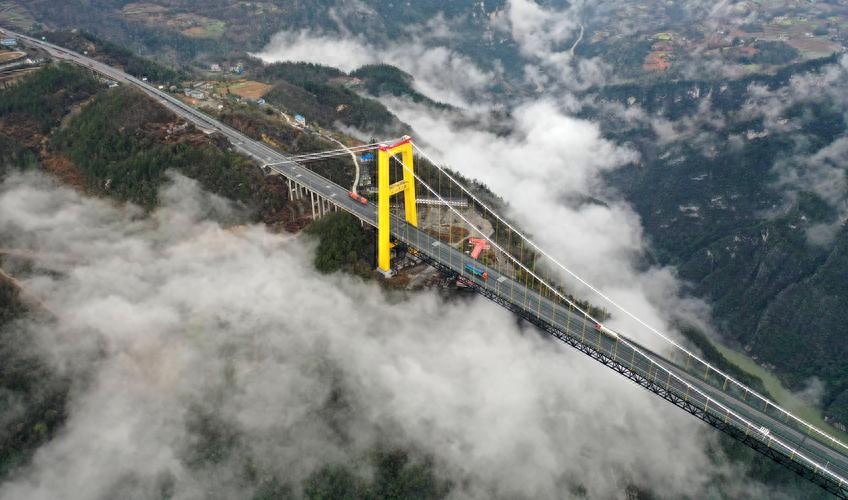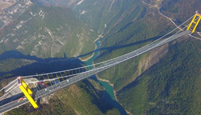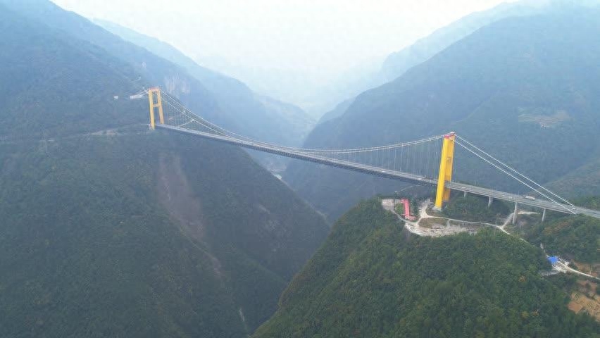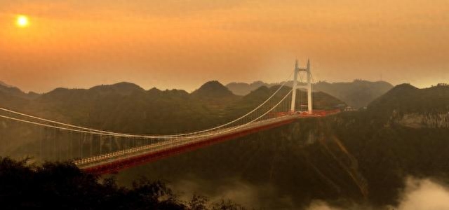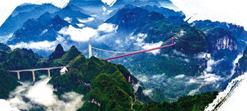 这是建造途中,动用火箭弹发射桥梁先导索建造的桥梁,开创了世界建桥史上的先例,该桥坐落于宜昌与恩施交界处的武陵山崇山峻岭中,地势险峻,桥面距离谷底有550米,全长有1365米是世界上第一高悬索桥。
