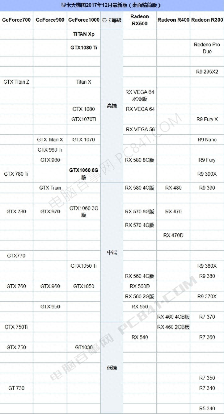 其它的A卡或者一些老显卡,性能级别可以直接参照下面的这张显卡天梯图。