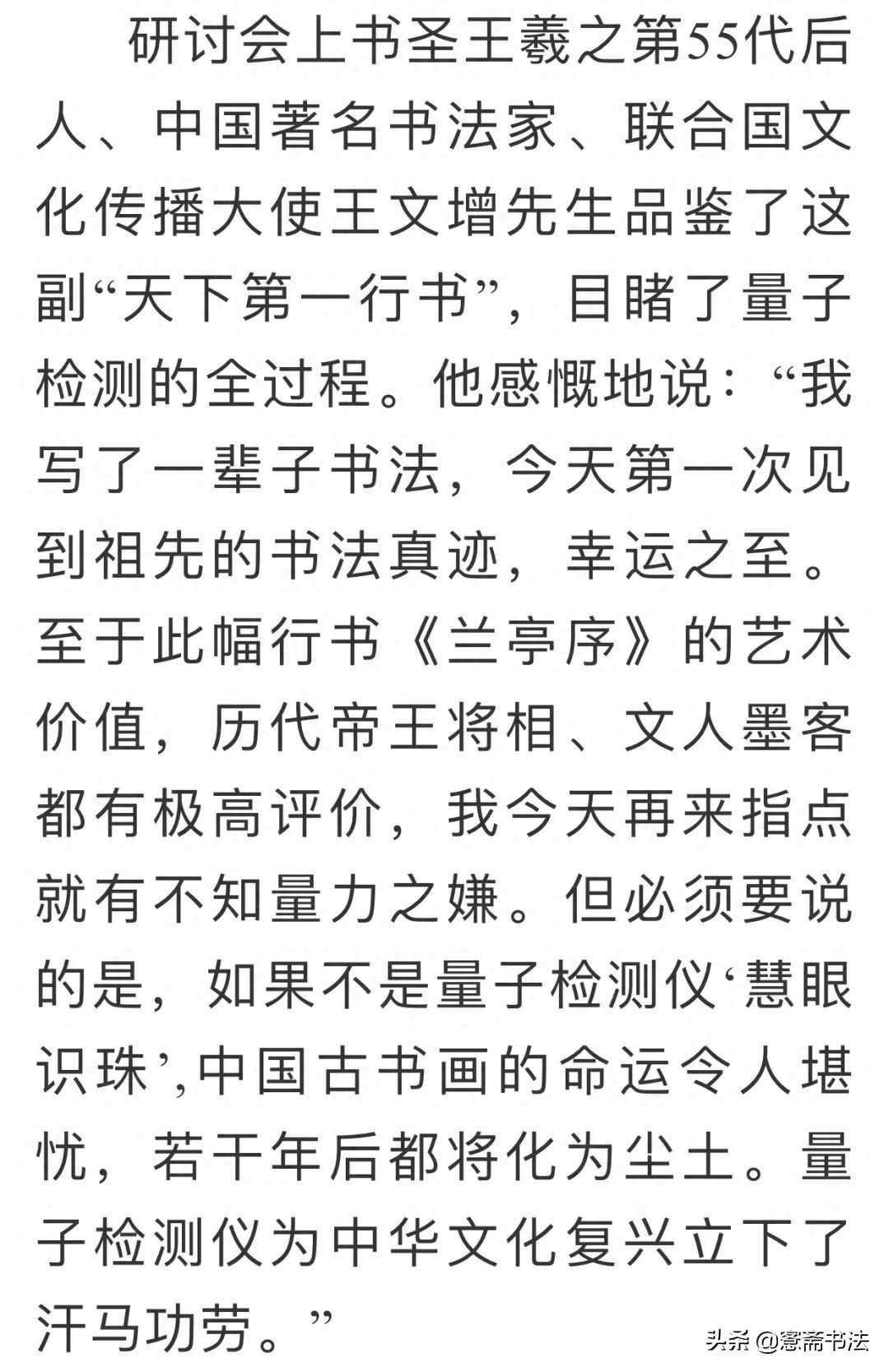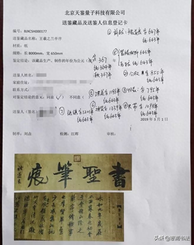 据某自媒体报道,2019年3月2日,由文保会和北京天鉴量子科技有限公司主办的中国古书画量子检测研讨会在京成功举行,数十件古代传世书画珍品荟萃一堂,这幅《兰亭序》真迹来自珠三角某位藏家的祖传,当这幅书法长卷通过“量子科技”年代检测之后,所有人都震惊了——