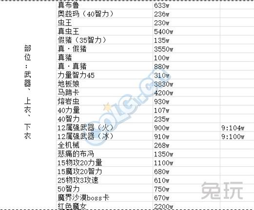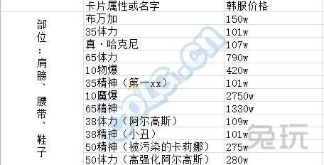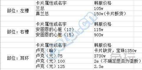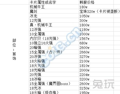 接下来就是各个部位的卡片价格了,表格以各个部位为基准进行归纳整理