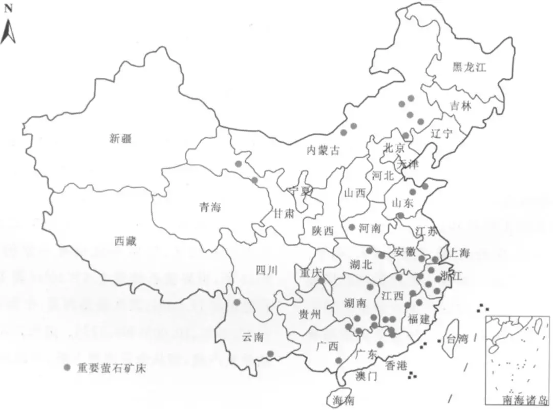 中国萤石资源丰富,分布广泛,除天津、上海、宁夏和西藏部分省市外,其余省市均有分布。主要分布于浙江、湖南、江西、福建、河南和内蒙古。大中型萤石矿床集中于东部沿海、华中和内蒙古中东部。