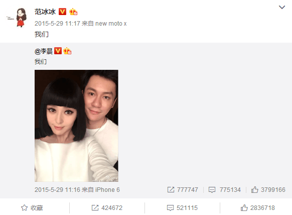 到了 2015年5月29日范冰冰再次PO出和李晨的合影,并配文:“我们”,才算是正式承认与李晨在热恋中。