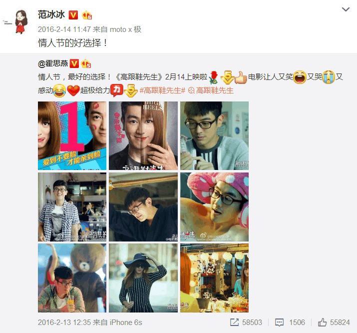 2016年的2月14日,应该算是范冰冰和李晨正式确定关系后过的第一个情人节,她先是转发了霍思燕的一条微博,给好朋友情人节档期的电影做宣传。顺便提一句,霍思燕夫妇和李晨的关系非常好哦~