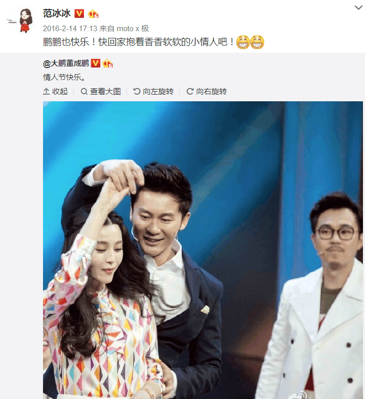 下午的时候,又转发了一条大鹏的微博,祝福对方情人节快乐,因为大鹏微博的配图,就是李晨和范冰冰啊!