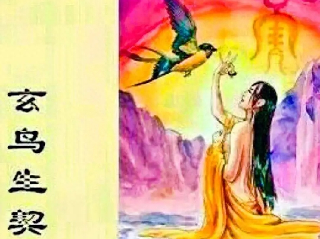 《史记•殷本纪》记载:殷契的母亲名叫简狄,她是有娀氏之女,是帝喾的妃子。简狄于河滨沐浴之时,看见一只玄鸟生蛋落水中,便吞下此蛋,因而有孕,生下契。契长大之后辅佐大禹治水有功。帝舜便把商地封给了他,赐姓子氏。后来,玄鸟演变成半人半禽的“人首鸟形”的神,最后变成人格化了的美丽女神。