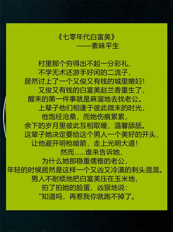 推语:知青文,女主上辈子经历了失败的婚姻,二婚后才遇到真爱,男主离世后女主重生在了头婚之前,知晓人生走向的女主,毅然决然的下乡去做了知青,只有这样,她才能够指引男主避免人生的弯路。男主出身地主家庭,因为身份问题一直被瞧不起,姐弟三人在穷苦中挣扎,女主的到来点亮了他人生的一盏灯,非常好看的作品!