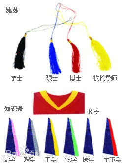 流苏分为:校长(导师)流苏、博士流苏、硕士流苏、学士流苏。