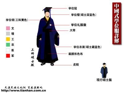 学士学位帽为方型黑色;博士学位帽流苏为红色,硕士学位帽流苏为深蓝色,校长帽流苏为黄色;博士学位袍为黑、红两色,硕士学位袍为蓝、深蓝两色,学士学位袍为全黑色,导师学位袍为红、黑两色,校长袍为全红色;垂布(见本文下面图示)饰边处按文学、理学、工学、农学、医学和军事六大类分别为粉、银灰、黄、绿、白和红色。