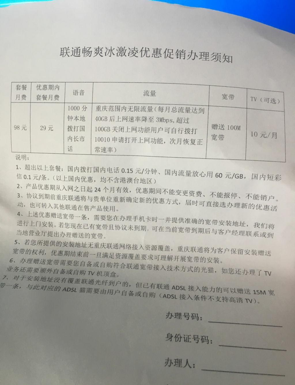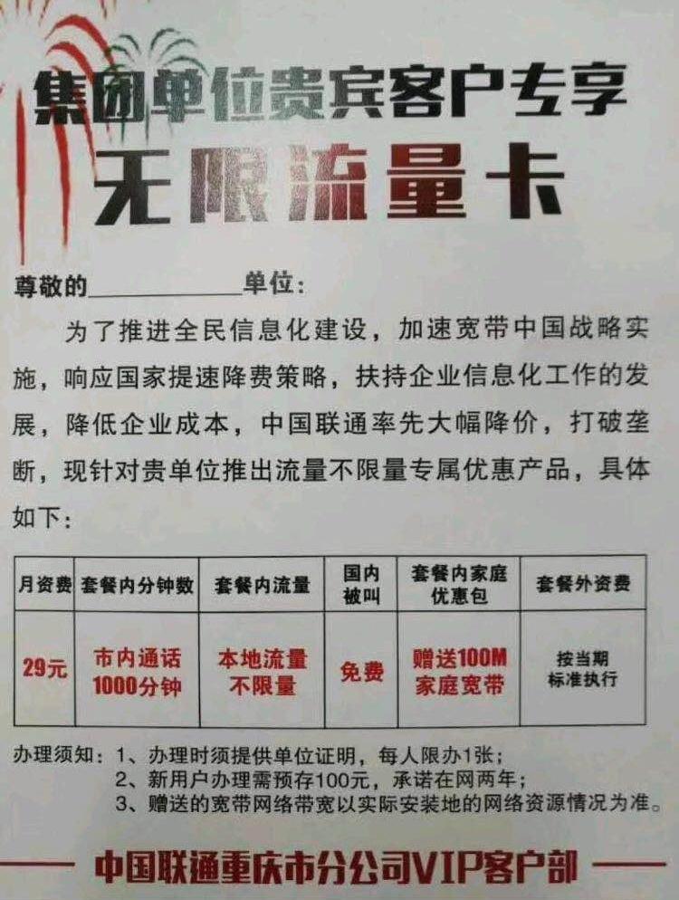 重庆联通推出29元本地不限量套餐,还赠送100M宽带