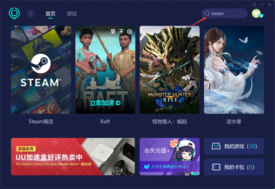 出现上述情况的时候,很多时候是网络出现了问题,建议使用加速工具,这里推荐使用UU,只需要在打开游戏之前打开uu,在软件内搜索《Steam商店》,选择自己的游玩平台,点击开启加速即可。网络环境将会大幅度优化,提升网速,无论何地都能做到低延迟0丢包,助大家畅快游戏。