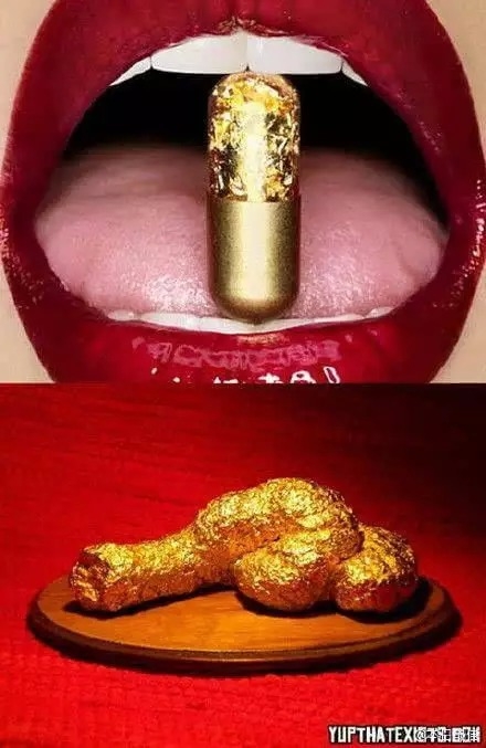 最近在日本的年轻姑娘之间很流行这种金粉胶囊“GLITTER PILLS”,由于内部的金粉在通过食道的过程中不会被消化,因此服用者会拉出金闪闪的便便。药丸的颜色很丰富,假如你希望在如厕完后回头看到某种颜色的闪闪发光的便便,只要在饭后服用即可。GLITTER PILLS的价格是每颗900日元,不在海外贩售。
