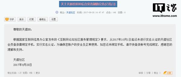 IT之家9月28日消息 今天下午天涯社区官方发布公告称,根据国家互联网信息办公室发布的《互联网论坛社区服务管理规定》要求,从2017年10月1日起还未进行实名认证的天涯社区会员登录需绑定手机,实行实名认证。与其他网站的规定相同,依然采用了后台实名的方式。