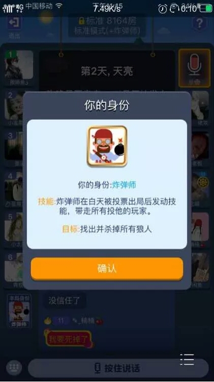 炸弹师的角色介绍如下,白天被投票就能带走所有的投票人员,真是个十足的社会报复型选手的天菜哈,小编也玩了几把,不过都出现了玩家未死就提前离开房间的,让其他小伙伴都很懊恼哈!