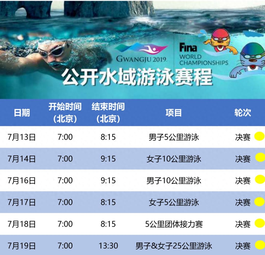 FINA国际泳联世锦赛的公开水域游泳项目将于7月13-19日在韩国丽水海洋公园举办。比赛项目包含5-25公里游泳,赛程如下: