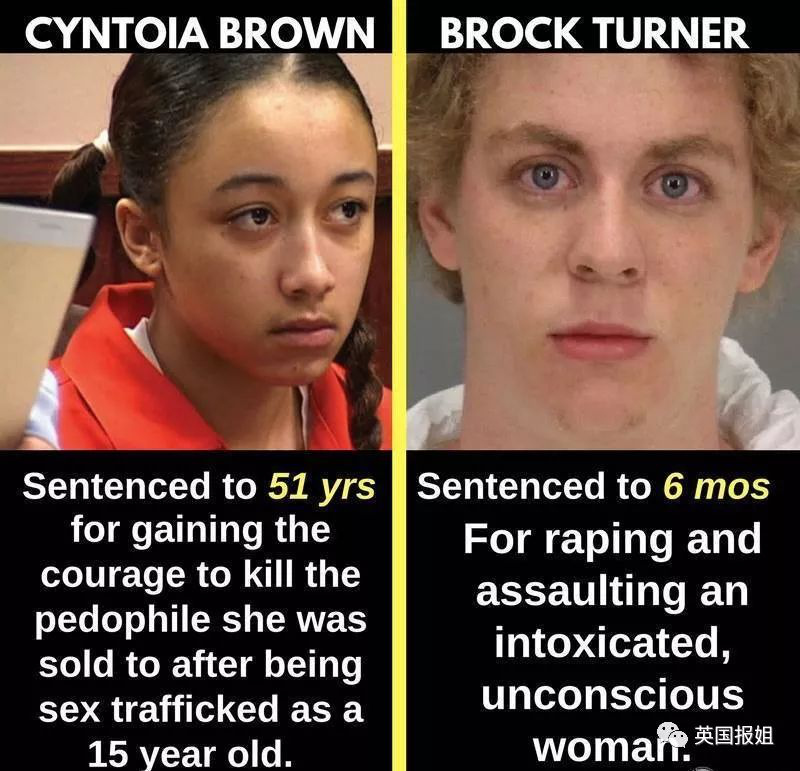 人们将她的案件,和三年前斯坦福大学的弟子 Brock Turner 的性侵被下药女弟子案件对于比起来。一个由于被性私运卖给老男子杀人判了无期,一个却在性侵女性实锤后,由于 " 年龄尚轻,大有所为 " 如许的缘由,只是被法官轻判六个月。