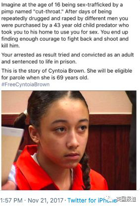 " 设想一下,一个 16 岁的女郎,被一个名喊‘割喉’的皮条客‘性私运 sex trafficking ’,数日里重复被下药、强奸,接着又被卖给一个 43 岁的恋童癖,被戴回家享受。当你毕竟饱脚勇气抵挡,举枪杀死他时,末尾却以成年犯的身份,被判无期徒刑。这便是辛托娅 · 布朗的小说。她惟有在 69 岁时,才有保释的权力。# 还辛托娅自在 "