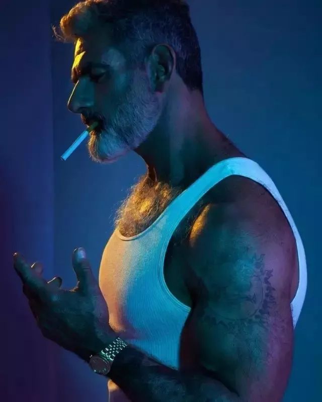 ▲强壮的肌肉、布满刺青的双臂和右侧小腿、经过经心整建而轻轻翘起的胡子……