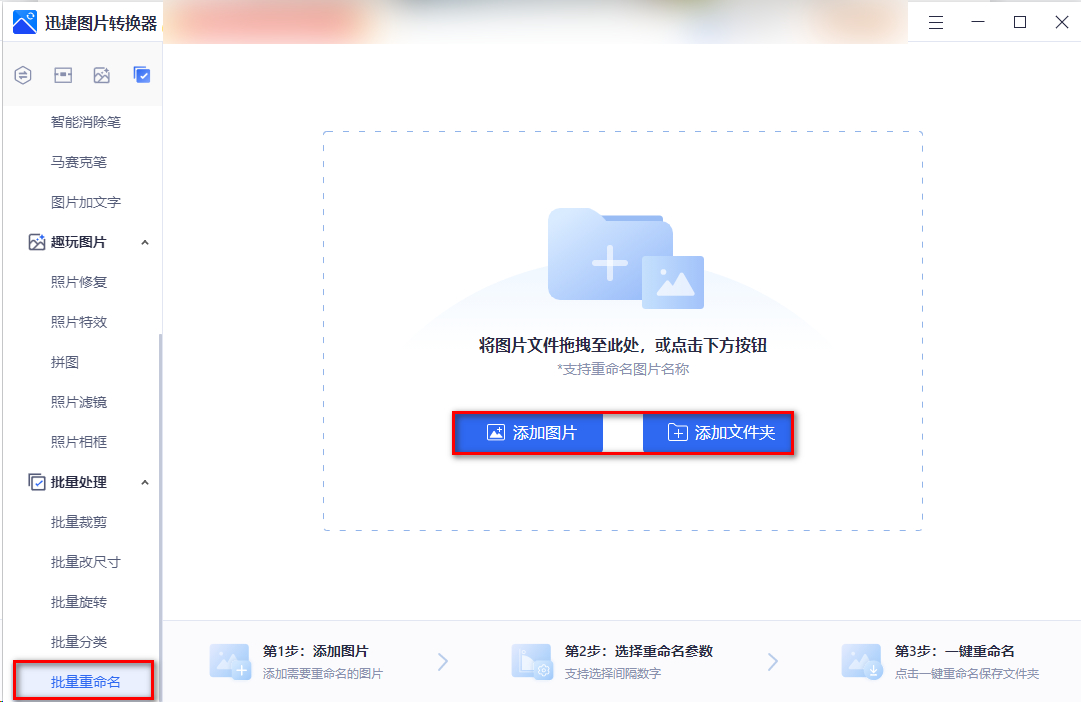 步骤一:打开已安装好的软件,选择“批量处理”中的“批量重命名”,然后再上传图片或者图片文件夹。