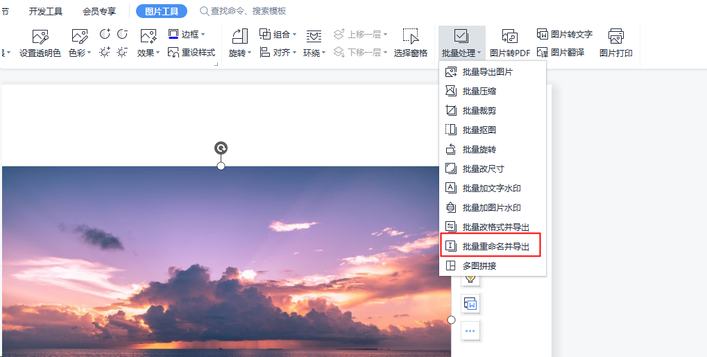 首先新建一个空白的文档,插入需要重命名的所有图片,接着点击上方菜单栏“图片工具”里的“批量处理”,再选择当中的“批量重命名并导出”,就可以完成批量重命名了。