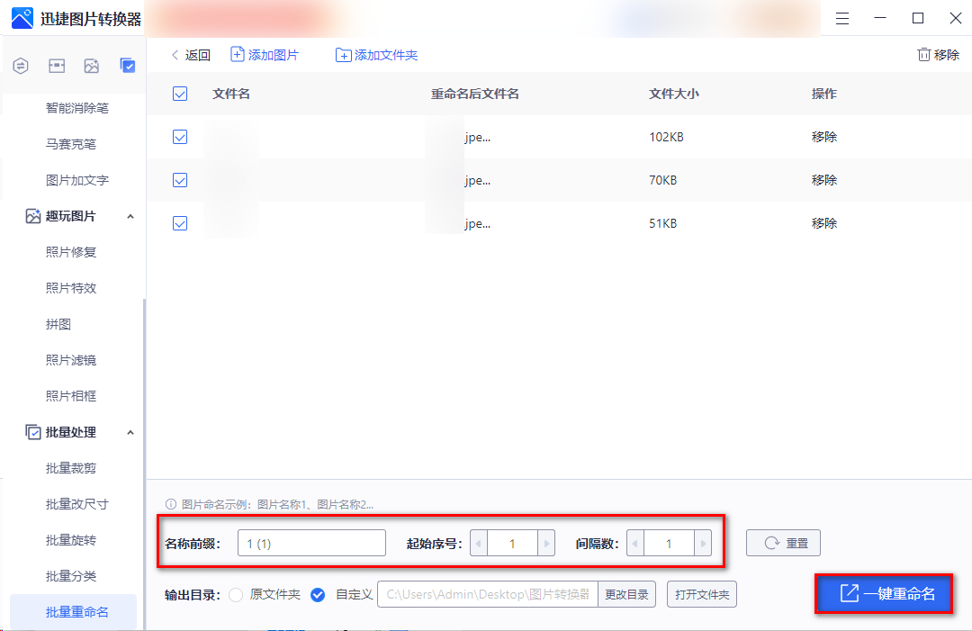 步骤二:根据自己的需要对添加的图片进行重命名,它支持选择起始序号和间隔数,并选择输出路径,方便日后查找图片,完成以后点击“一键重命名”即可。