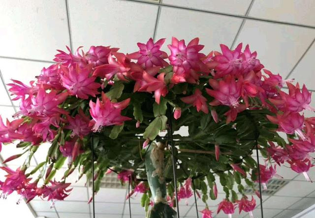 蟹爪兰开花就像一朵朵的小精灵,叶片肥厚翠绿,一节一节。可以观花,也可以观叶。蟹爪兰自身的根系不太发达,一般把它嫁接在仙人掌或者是叶仙上,开花时五颜六色,开成花树,深得人们喜爱。