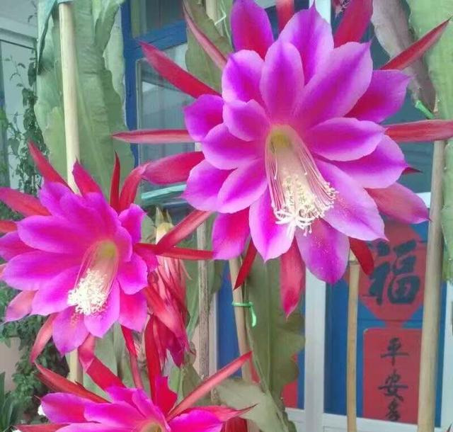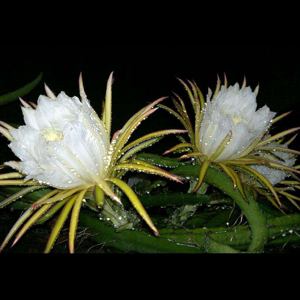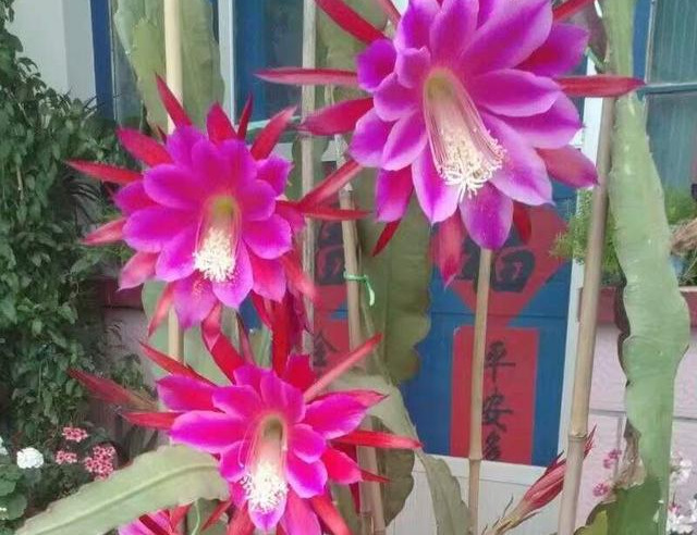 火龙果也属于仙人掌科的植物。它的花也是特别漂亮的,同时还有三棱箭等等,开起花来,硕大无比还可以做成美味。