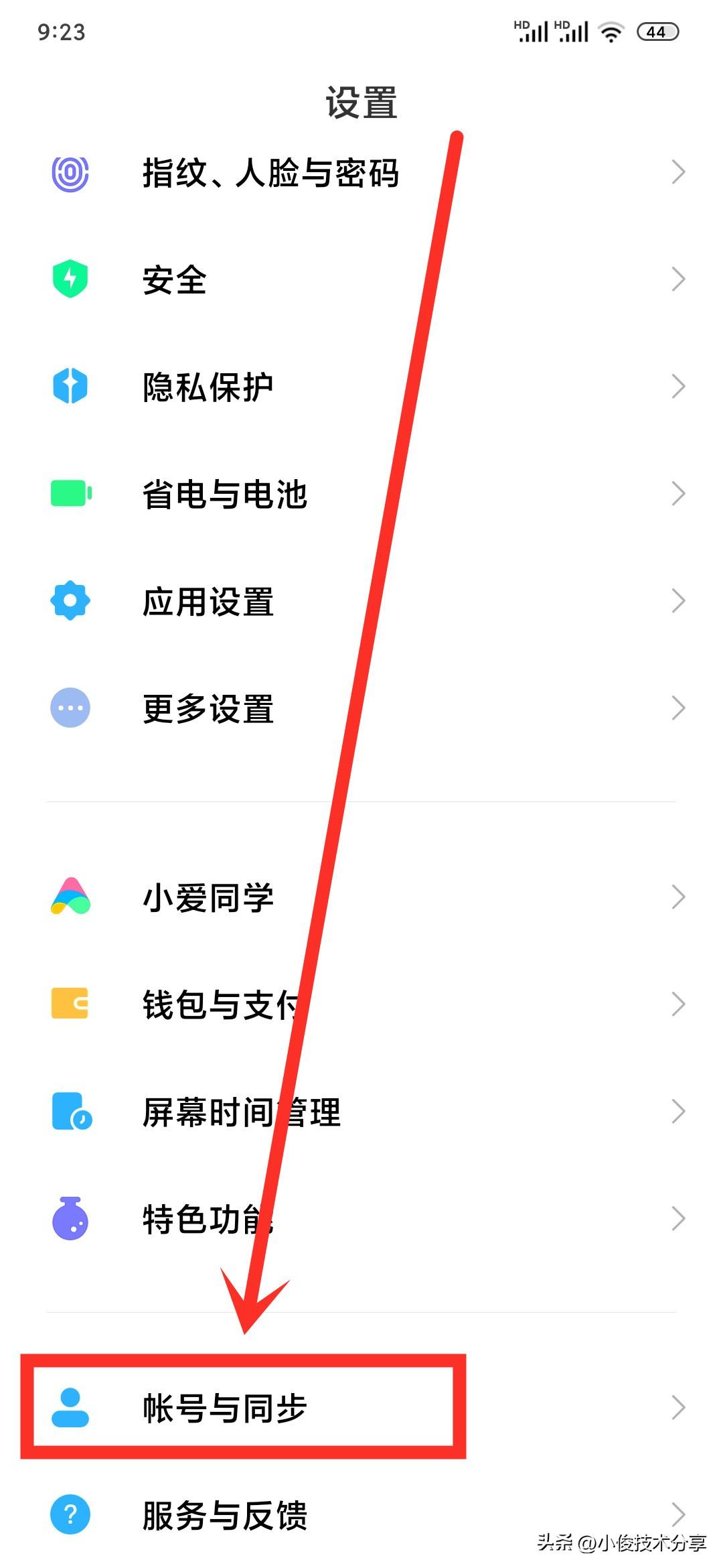 我们打开手机设置,接着往下找到【账号与同步】