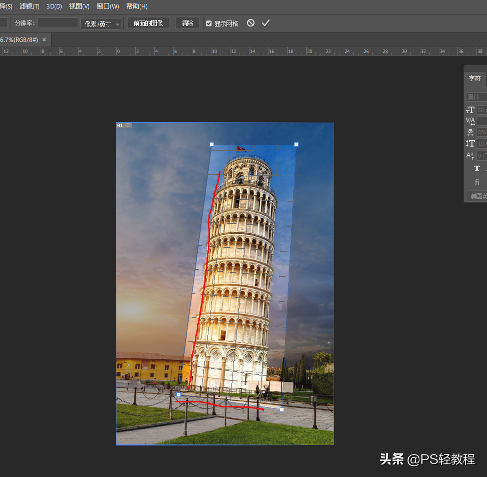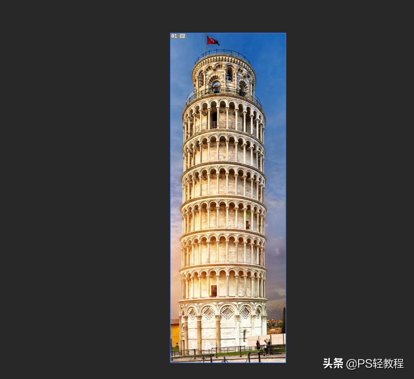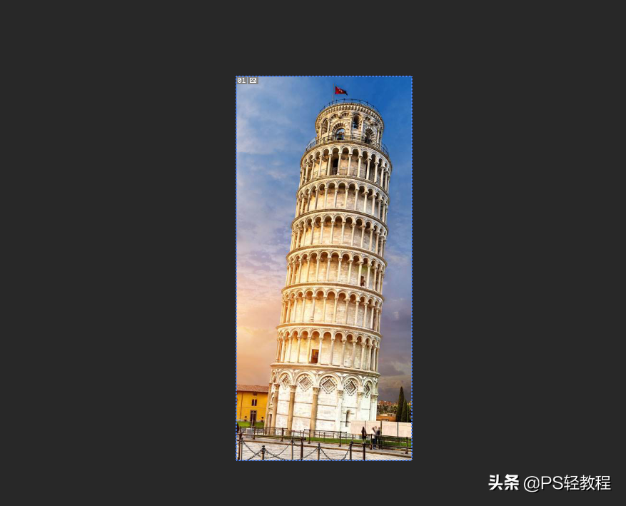 案例二:如何将斜塔修正回来,不让它倾斜!导入我们的素材斜塔;然后选择透视裁剪工具,先框选住主元素,然后调整透视裁剪工具,记着:透视线与我们的主元素保持平行,选择之后,回车确定选区或者用对号确认;如下图: