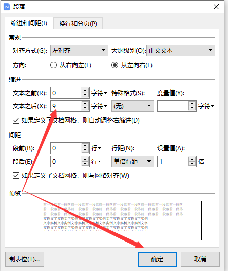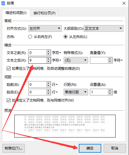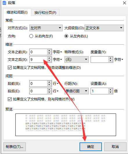 3.在弹出页面,缩进的文本设置为“0字符”,点击确定,解决不满一行自动换行的问题。