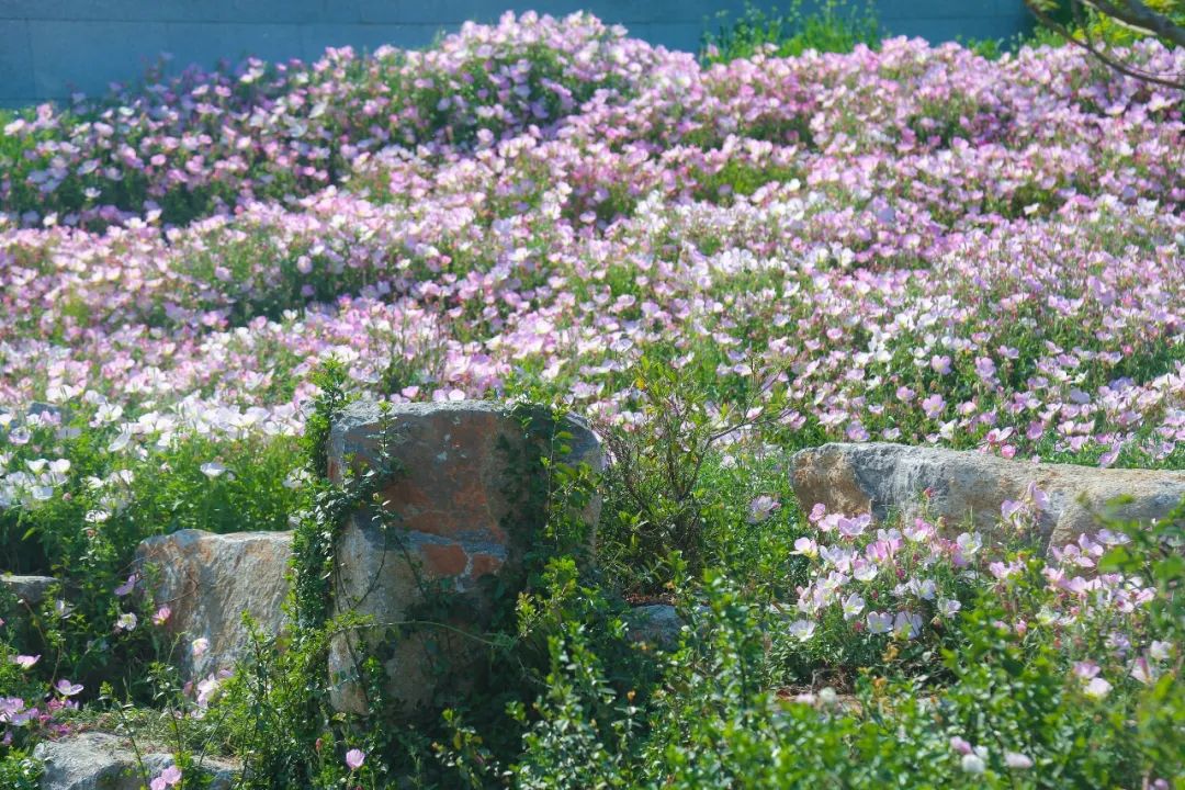 尼山的五月不止于此,远处山坡上、草丛中,大片大片的月见草花海也在宣誓着初夏的到来,娇柔可人。稍有微风吹过,花瓣便会轻轻晃动,温柔雅致,让人在不经意间卸下盔甲,让心灵呈现原有的柔软。