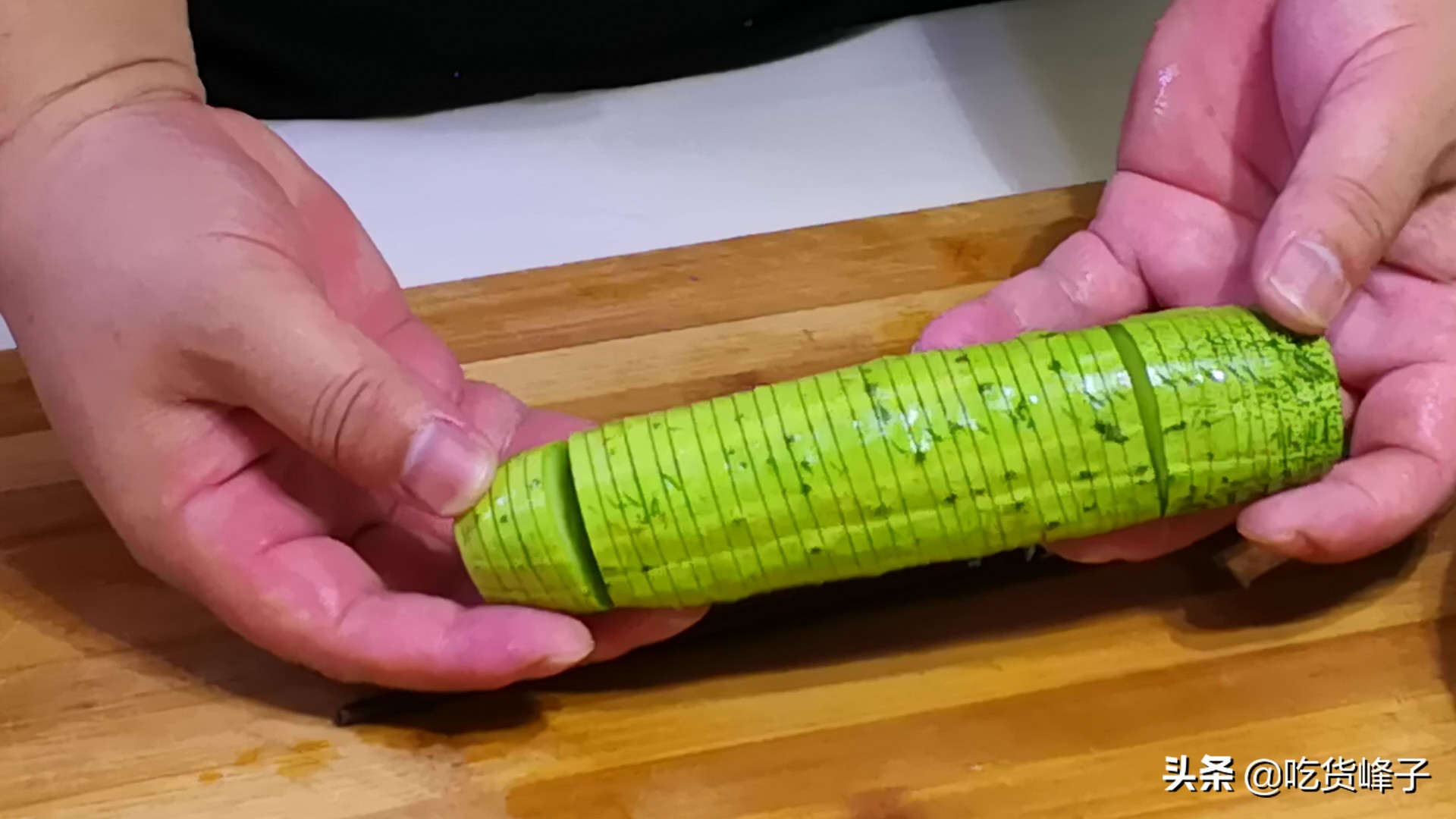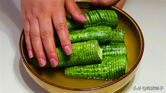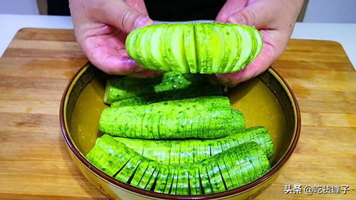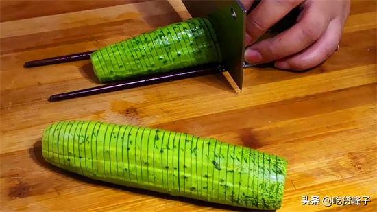 1.黄瓜去掉头尾,用2根筷子夹住横着切花刀,厚度0.5公分左右即可,底部不要切断。